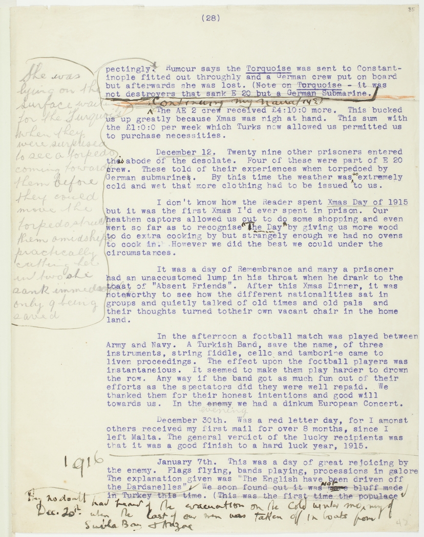 The AE 2 crew received £4:10:0 more. This bucked us up greatly because Xmas was nigh at hand. This sum with the £1:0:0 per week which Turks now allowed us permitted us to purchase necessities.