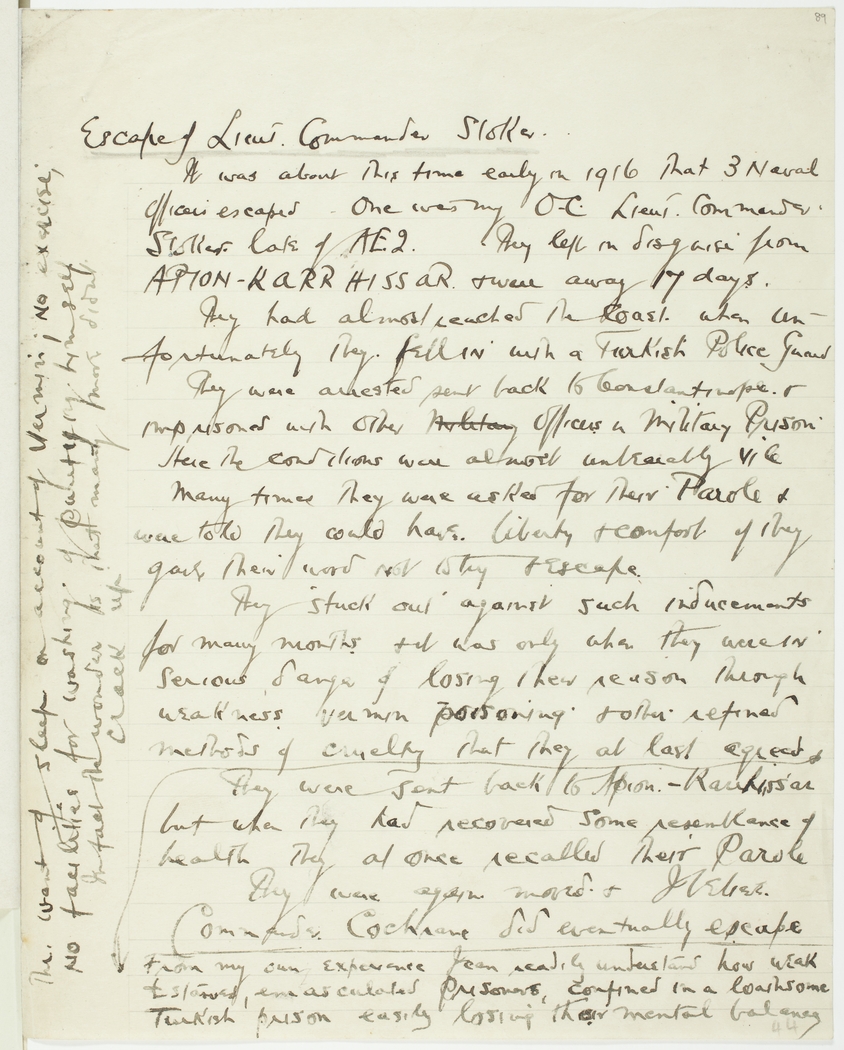 It was about this time early in 1916 that 3 Naval officers escaped. One was my O.C. Lieut. Commander Stoker late of AE 2. They left in disguise from Affion-karrhissar & were away 7 days.