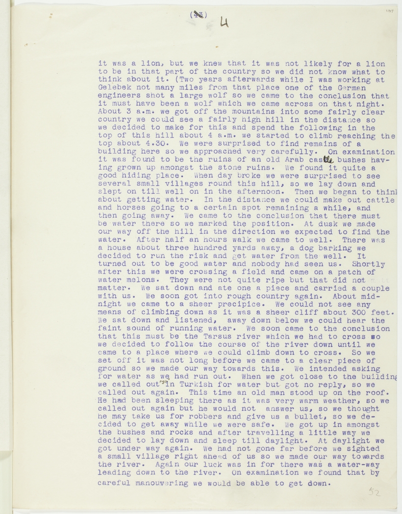 it was a lion, but we knew that it was not likely for a lion to be in that part of the country so we did not know what to think about it. (Two years afterwards while I was working at Gelebek not many miles from that place one of the German engineers shot a large wolf so we came to the conclusion that it must have been a wolf which we came across on that night. About 3 a.m. we got off the mountains into some fairly clear country we could see a fairly high hill in the distance so we decided to make for this and spend the following in the top of this hill about 4 a.m. we started to climb reaching the top about 4.30. We were surprised to find remains of a building here so we approached very carefully. On examination it was found to be the ruins of an old Arab castle bushes having grown up amongst the stone ruins. We found it quite a good hiding place. When day broke we were surprised to see several small villages round this hill, so we lay down and slept on till well on in the afternoon. Then we began to think about getting water. In the distance we could make out cattle and horses going to a certain spot remaining a while, and then going away. We came to the conclusion that there must be water there so we marked the position. At dusk we made our way off the hill in the direction we expected to find the water. After half an hours walk we came to well. There was a house about three hundred yards away, a dog barking we decided to run the risk and get water from the well. It turned out to be good water and nobody had seen us. Shortly after this we were crossing a field and came on a patch of water melons. They were not quite ripe but that did not matter. We sat down and ate one a piece and carried a couple with us. We soon got into rough country again. About midnight we came to a sheer precipice. We could not see any means of climbing down as it was a sheer cliff about 300 feet. We sat down and listened, away down below we could hear the faint sound of running water. We soon came on the conclusion that this must be the Tarsus river which we had to cross so we decided to follow the course of the river down until we came to a place where we could climb down to cross. So we set off it was not long before we came to a clear piece of ground so we made our way towards this. We intended asking for water as we had run out. When we got close to the building we called out "su" in Turkish for water but got no reply, so we called out again. This time an old man stood up on the roof. He had been sleeping there as it was very warm weather, so we called out again but he would not answer us, so we thought he may take us for robbers and give us a bullet, so we decided to get away while we were safe. We got up in amongst the bushes and rocks and after travelling a little way we decided to lay down and sleep till daylight. At daylight we got under way again. We had not gone far before we sighted a small village right ahead of us so we made our way towards the river. Again our luck was in for there was a water-way leading down to the river. On examination we found that by careful manouvering we would be able to get down.