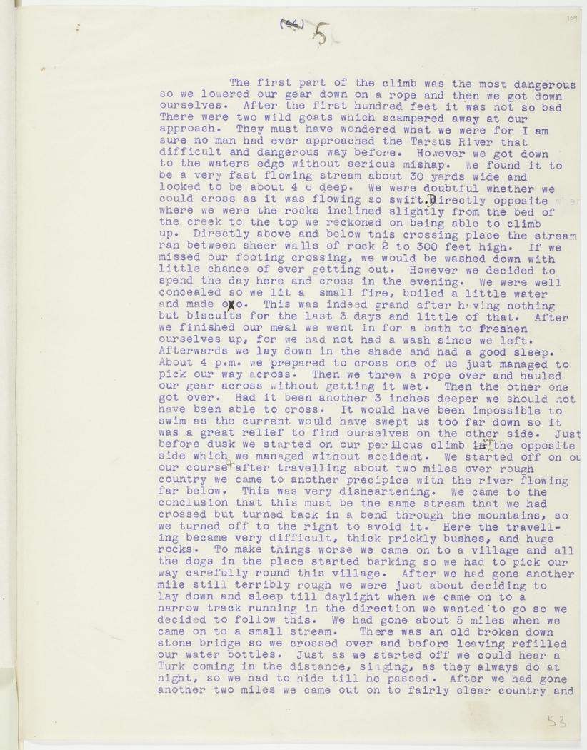 The first part of the climb was the most dangerous so we lowered our gear down on a rope and then we got down ourselves. After the first hundred feet it was not so bad There were two wild goats which scampered away at our approach. They must have wondered what we were for I am sure no man had ever approached the Tarsus River that difficult and dangerous way before. However we got down to the waters edge without serious mishap. We found it to be a very fast flowing stream about 30 yards wide and looked to be about 4[to?] 6 deep. We were doubtful whether we could cross it as it was flowing so swift. Directly opposite where we were the rocks inclined slightly from the bed of the creek to the top we reckoned on being able to climb up. Directly above and below this crossing place the stream ran between sheer walls of rock 2 to 300 feet high. If we missed our footing crossing, we would be washed down with little chance of ever getting out. However we decided to spend the day here and cross in the evening. We were well concealed so we lit a small fire, boiled a little water and made oxo. This was indeed grand after having nothing but biscuits for the last 3 days and little of that. After we finished our meal we went in for a bath to freshen ourselves up, for we had not had a wash since we left. Afterwards we lay down in the shade and had a good sleep. About 4 p.m. we prepared to cross one of us just managed to pick our way across. Then we threw a rope over and hauled our gear across without getting it wet. Then the other one got over. Had it been another 3 inches deeper we should not have been able to cross. It would have been impossible to swim as the current would have swept us too far down so it was a great relief to find ourselves on the other side. Just before dusk we started on our perilous climbin up the opposite side which we managed without accident. We started off on our course & after travelling about two miles over rough country we came to another precipice with the river flowing far below. This was very disheartening. We came to the conclusion that this must be the same stream that we had crossed but turned back in a bend through the mountains, so we turned off to the right to avoid it. Here the travelling became very difficult, thick prickly bushes, and huge rocks. To make things worse we came on to a village and all the dogs in the place started barking so we had to pick our way carefully round this village. After we had gone another mile still terribly rough we were just about deciding to lay down and sleep till daylight when we came on to a narrow track running in the direction we wanted to go so we decided to follow this. We had gone about 5 miles when we came on to a small stream. There was an old broken down stone bridge so we crossed over and before leaving refilled our water bottles. Just as we started off we could hear a Turk coming in the distance, singing, as they always do at night, so we had to hide till he passed. After we had gone another two miles we came out to fairly clear country and