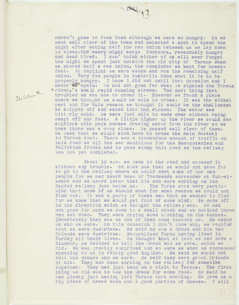 weren't game to face them although we were so hungry. So we went well clear of the town and selected a spot to spend the night after eating half the raw onion between us we lay down to sleep. the weary night away, footsore, ravenously hungry and dead tired. I don't think either of us will ever forget the night we spent just outside the old city of Tarsus when we shared half a raw onion, the remainder we kept for breakfast. At daylight we were awake and ate the remaining half onion. Very few people in Australia know what it is to be properly hungry. I know I did not until that occasion and I never do want to again. We had not gone far when we sighted the Tarsus river, (The Seihun R.) a small rapid running stream. The next thing that troubled us was how to cross it. However we found a place where we thought we would be able to cross. It was the widest part and for this reason we thought it would be the shallowest We shipped off and waded into the stream. The water was bitterly cold. We were just able to wade over without being swept off our feet. A little higher up the river we could see soldiers with pack horses drawing water from the river so we knew there was a camp close. We passed well clear of them. We knew that we would soon have to cross the main Bozanti to Tarsus Road. There was a tremendous amount of traffic on this road as all the war munitions for the Mesopotamian and Palistine fronts had to pass along this road as the railway was not yet completed.