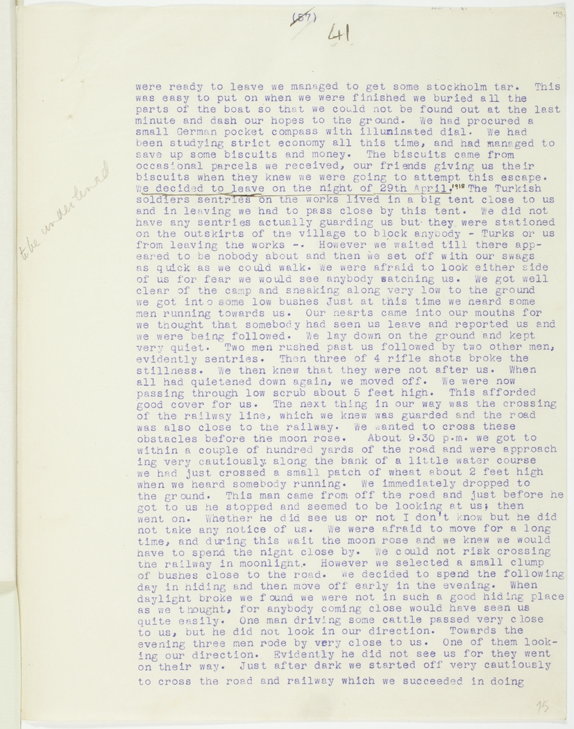 The Turkish soldiers sentries on the works lived in a big tent close to us and in leaving we had to pass close by this tent. We did not have any sentries actually guarding us but they were stationed on the outskirts of the village to block anybody- Turks or us from leaving the works-. However we waited till there appeared to be nobody about and then we set off with our swags as quick as we could walk. We were afraid to look either side of us for fear we would see anybody watching us. We got well clear of the camp and sneaking along very low to the ground we got into some low bushes Just at this time we heard some men running towards us. Our hearts came into our mouths for we thought that somebody had seen us leave and reported us and we were being followed. We lay down on the ground and kept very quiet. Two men rushed past us followed by two other men, evidently sentries. Then three of 4 rifle shots broke the stillness. We then knew that they were not after us. When all had quietened down again, we moved off. We were now passing through low scrub about 5 feet high. This afforded good cover for us. The next thing in our way was the crossing of the railway line, which we knew was guarded and the road was also close to the railway. We wanted to cross these obstacles before the moon rose. About 9.30 p.m. we got to within a couple of hundred yards of the road and were approaching very cautiously along the bank of a little water course we had just crossed a small patch of wheat about 2 feet high when we heard somebody running. We immediately dropped to the ground. This man came from off the road and just before he got to us he stopped and seemed to be looking at us; then went on. Whether he did see us or not I don't know but he did not take any notice of us. We were afraid to move for a long time, and during this wait the moon rose and we knew we would have to spend the night close by. We could not risk crossing the railway in moonlight. However we selected a small clump of bushes close to the road. We decided to spend the following day in hiding and then move off early in the evening. When daylight broke we found we were not in such a good hiding place as we thought, for anybody coming close would have seen us quite easily. One man driving some cattle passed very close to us, but he did not look in our direction. Towards the evening three men rode by very close to us. One of them looking our direction. Evidently he did not see us for they went on their way. Just after dark we started off very cautiously to cross the road and railway which we succeeded in doing.