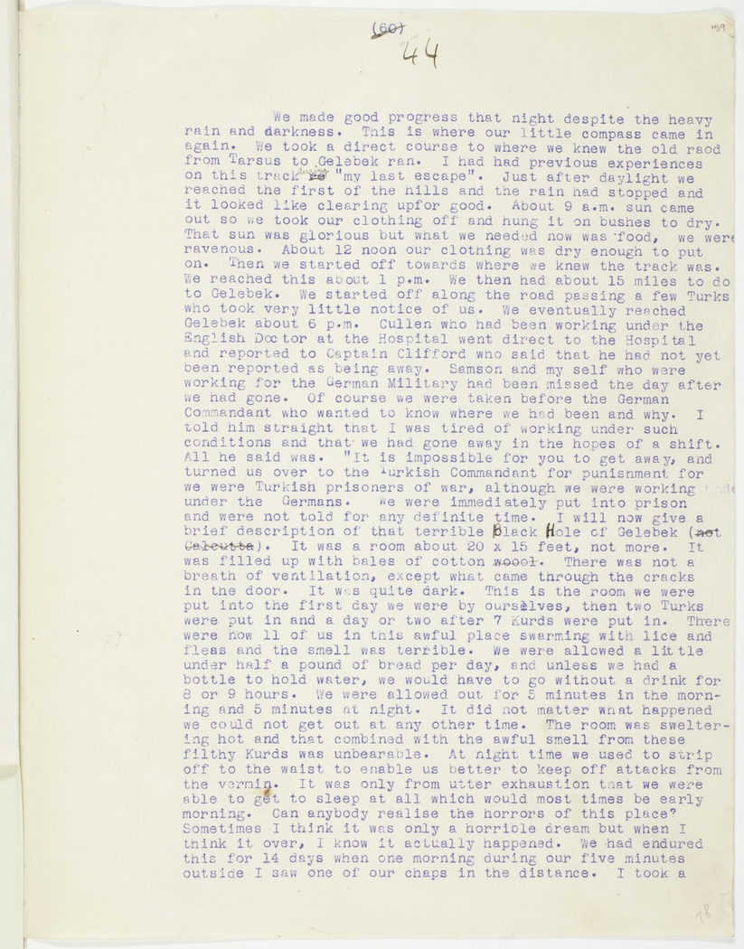 We made good progress that night despite the heavy rain and darkness. This is where our little compass came in again. We took a direct course to where we knew the old raod from Tarsus to Gelebek ran. I had had previous experiences on this track during "my last escape". Just after daylight we reached the first of the hills and the rain had stopped and it looked like clearing up for good. About 9 a.m. sun came out so we took our clothing off and hung it on bushes to dry. That sun was glorious but what we needed now was food, we were ravenous. Then we started off towards where we knew the track was. We reached this about 1 p.m. We then had about 15 miles to do to Gelebek. We started off along the road passing a few Turks who took very little notice of us. We eventually reached Gelebek about 6 p.m. Cullen who had been working under the English Doctor at the Hospital went direct to the Hospital and reported to Captain Clifford who said that he had not yet been reported as being away. Samson and my self who were working for the German Military had been missed the day after we had gone. Of course we were taken before the German Commandant who wanted to know where we had been and why. I told him straight that I was tired of working under such conditions and that we had gone away in the hopes of a shift. All he said was. "It is impossible for you to get away, and turned us over to the Turkish Commandant for punishment for we were Turkish prisoners of war, although we were working under the Germans. We were immediately put into prison and were not told for any definite time. I will now give a brief description of that terrible Black Hole of Gelebek (not Calcutta). It was a room about 20 x 15 feet, not more. It was filled with bales of cotton woool. There was not a breath of ventilation, except what came through the cracks in the door. It was quite dark. This is the room we were put into the first day we were by ourselves, then two Turks were put in and a day or two after 7 Kurds were put in. There were now 11 of us in this awful place swarming with lice and fleas and the smell was terrible. We were allowed a little under half a pound of bread per day, and unless we had a bottle to hold water, we would have to go without a drink for 8 or 9 hours. We were allowed out for 5 minutes in the morning and 5 minutes at night. It did not matter what happened we could not get out at any other time. The room was sweltering hot and that combined with the awful smell from these filthy Kurds was unbearable. At night time we used to strip off to the waist to enable us better to keep off attacks from the vermin. It was only from utter exhaustion that we were able to get to sleep at all which would most times be early morning. Can anybody realise the horrors of this place? Sometimes I think it was only a horrible dream but when I think it over, I know it actually happened. We had endured this for 14 days when one morning during our five minutes outside I saw one of our chaps in the distance. I took a