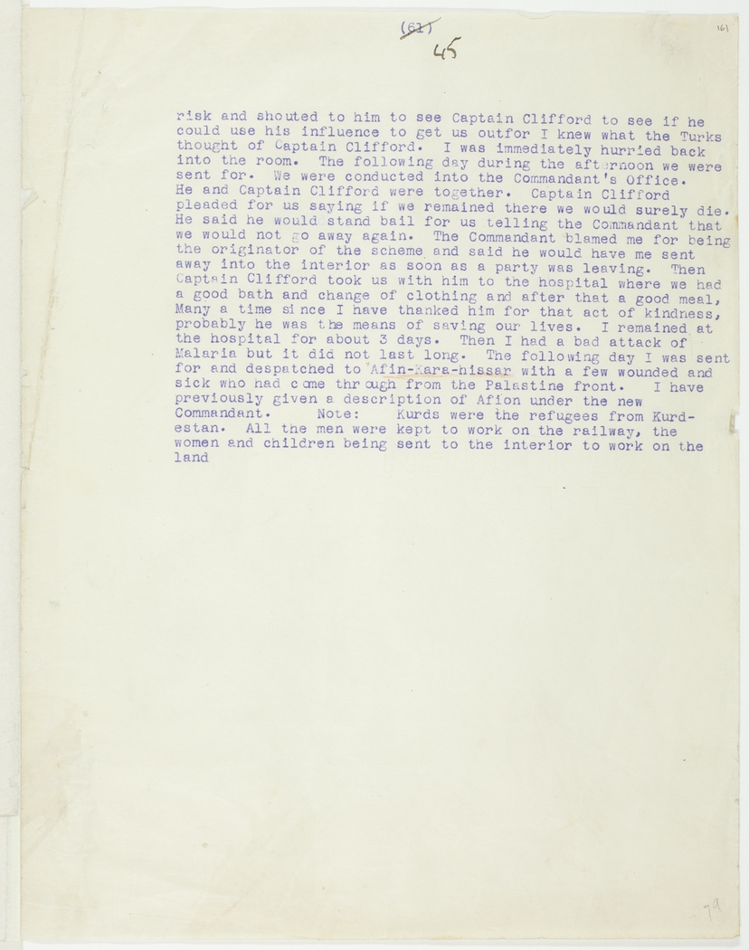 risk and shouted to him to see Captain Clifford to see if he could use his influence to get us out for I knew what the Turks thought of Captain Clifford. I was immediately hurried back into the room. The following day during the afternoon we were sent for. We were conducted into the Commandant's Office. He and Captain Clifford were together. Captain Clifford pleaded for us saying if we remained there we would surely die. He said he would stand bail for us telling the Commandant that we would not go away again. The Commandant blamed me for being the originator of the scheme and said he would have me sent away into the interior as soon as a party was leaving. Then Captain Clifford took us with him to the hospital where we had a good bath and change of clothing and after that a good meal, Many a time since I have thanked him for that act of kindness, probably he was the means of saving our lives. I remained at the hospital for about 3 days. Then I had a bad attack of Malaria but it did not last long. The following day I was sent for and despatched to Afin-Kara-hissar with a few wounded and sick who had come through from the Palastine front. I have previously given a description of Afion under the new Commandant.