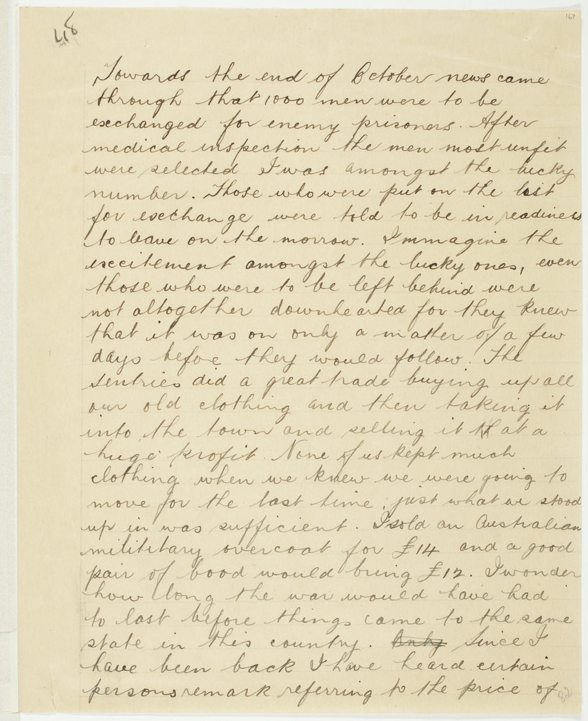 Towards the end of October news came through that 1000 men were to be exchanged for enemy prisoners. After medical inspection the men most unfit were selected I was amongst the lucky number. Those who were put on the list for exchange were told to be in readiness to leave on the morrow. Immagine the excitement amongst the lucky ones, even those who were to be left behind were not altogether downhearted for they knew that it was on only a matter of a few days before they would follow. The sentries did a great trade buying up all our old clothing and then taking it into the town and selling it th at a huge profit. None of us kept much clothing when we knew we were going to move for the last time, just what we stood up in was sufficient. I sold an Australian military overcoat for £14 and a good pair of bood would bring £12. I wonder how long the war would have had to last before things came to the same state in this country. Only Since I have been back I have heard certain persons remark referring to the price of