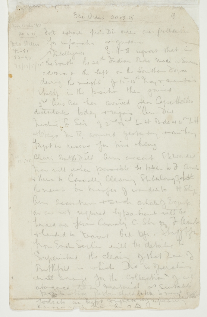 Clearing Battle Field. Arms accout[rements] etc Wounded men will when possible be taken to F Amb & thence to Casualty Clearing Stn belong to [the men. On transfer of wounded to H Ship Arms Accoutrem & such articles of Equip as are not required by patient will be handed over from Casualty C. Stn or F Unit & handed to nearest Ord Ofr. Staff Ofr from Each Section will be detailed to Superintend the cleaning of that Zone of Battlefield in which Div is operating & will arrange for the collection of all abandoned to or material at suitable positn from whence the stores should be taken to nearest [Indecipherable]