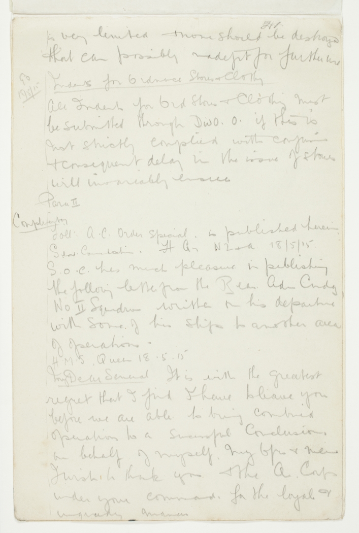 Foll: A.C Order Special is published herein. Gen Commendation. As NZ & A 18/5/15 G.O.C has much pleasure in publishing the following letter from Rear Adm Cmdg No II Squadron written on his departure with some of his ships to another area of operation.