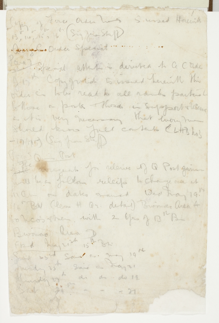 Para 7 Special attention is directed to GC order July 17th Copy of which is issued herewith. This order is to be read to all ranks particularly to those on posts & those in support & Reserve as it is very necessary that every man should know full contents (LHB No 3 – 17/5/15) (Sig from Staff)