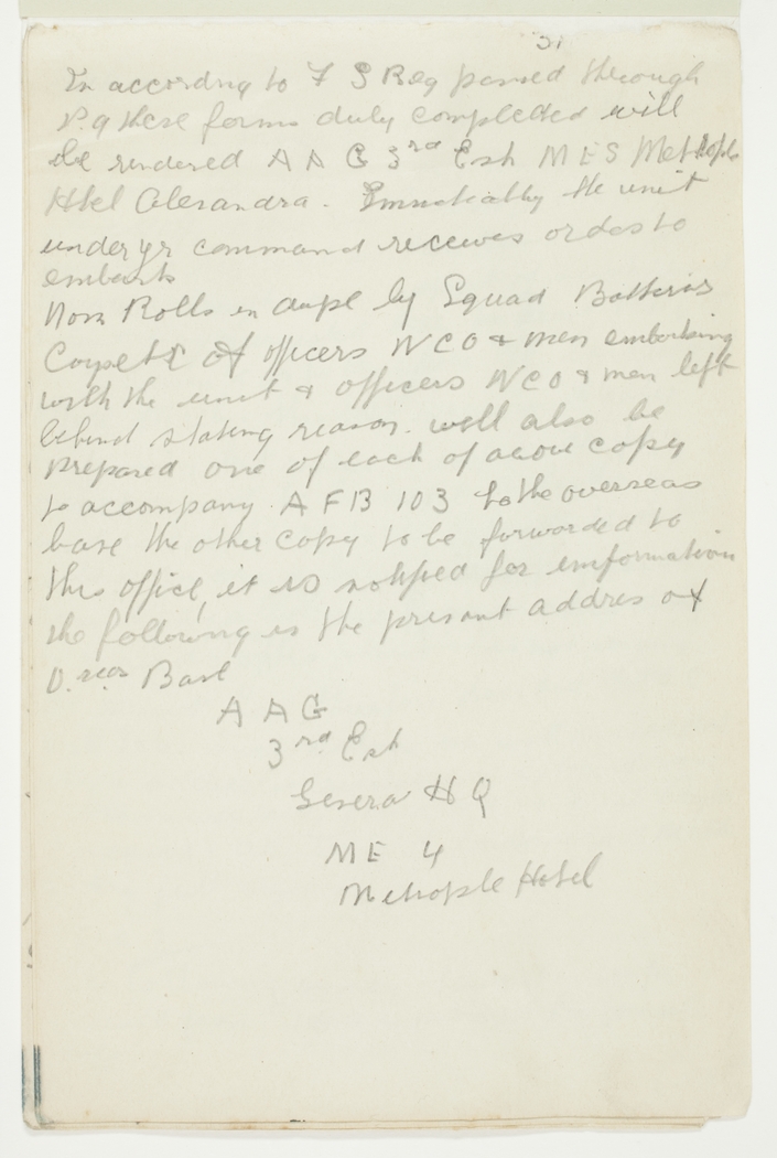 In according to F S Reg passed through P.9 these forms duly completed will be rendered AAG 3rd Esh MES Metropole Hotel Alexandra. Immediately the unit under yr command receives orders to embark