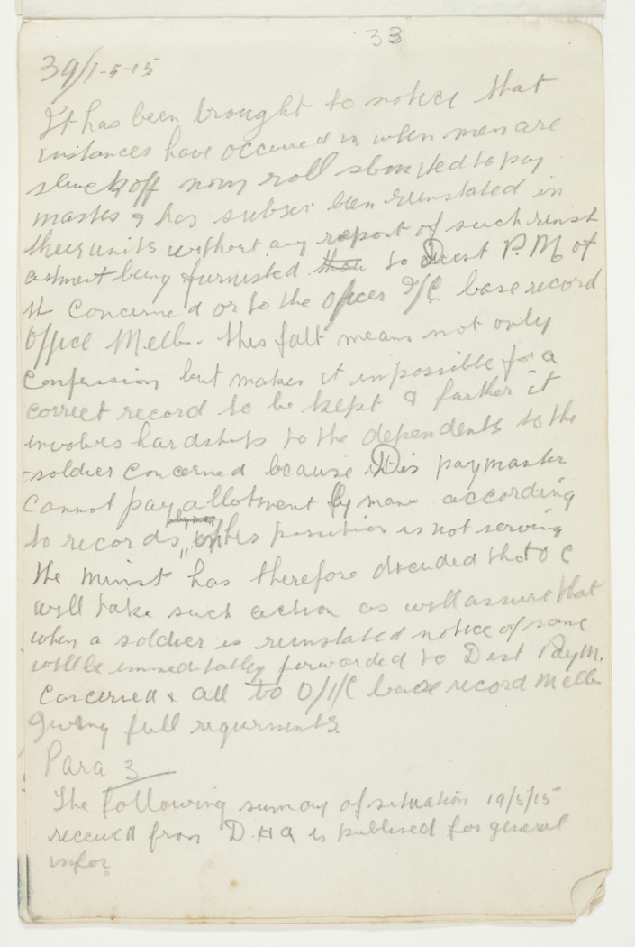 It has been brought to notice that instances have occurred in when men are struck of nom roll submitted to pay master & has subseq been reinstated in their units without any report of such reinstatement being furnished to Dist P.M [Paymaster] of the Concerned or to the officer I/C base record Office Melb. This falt means not only Confusion but makes it impossible for a correct record to be kept & further it involves hardships to the dependents to the soldier concerned because Dis paymaster cannot pay allotment by mans according to records on his position is not serving The Minst has therefore decided that OC will take such action as will assure that when a soldier is reinstated notice of same will be immediately forwarded to Dist PayM Concerned & all to O/I/C base record Melb giving full requirements.