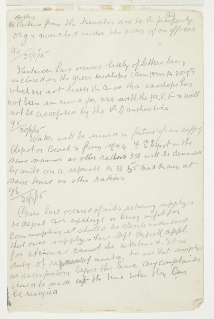Instances have occurred lately of letters being enclosed in the green envelope (arm form A 3 [Indecipherable] 8 which are not liable the Censor this envelope has not been sanctioned for use with the M.E.F & will not be accepted by the P.O Authorities.