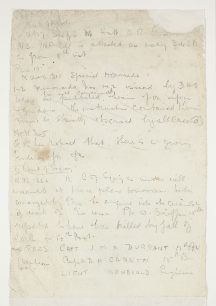 KR666 A C of Enquiry as under will assemble at time & place tomorrow to be arranged by Pres to enquire into the circumst of death of No 442 Pte W. Griffin 15Bn reported to have been killed by fall of earth on 16th Inst.
