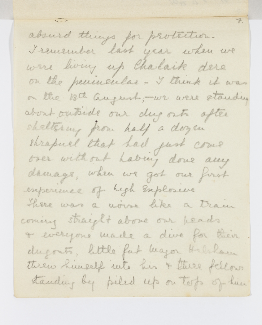absurd things for protection. I remember last year when we were living up Chalaik dere on the peninsular €“ I think it was on the 13th August, - we were standing about outside our dug outs after sheltering from half a dozen shrapnel that had just come over without having done any damage, when we for our first experience of high Explosive.
