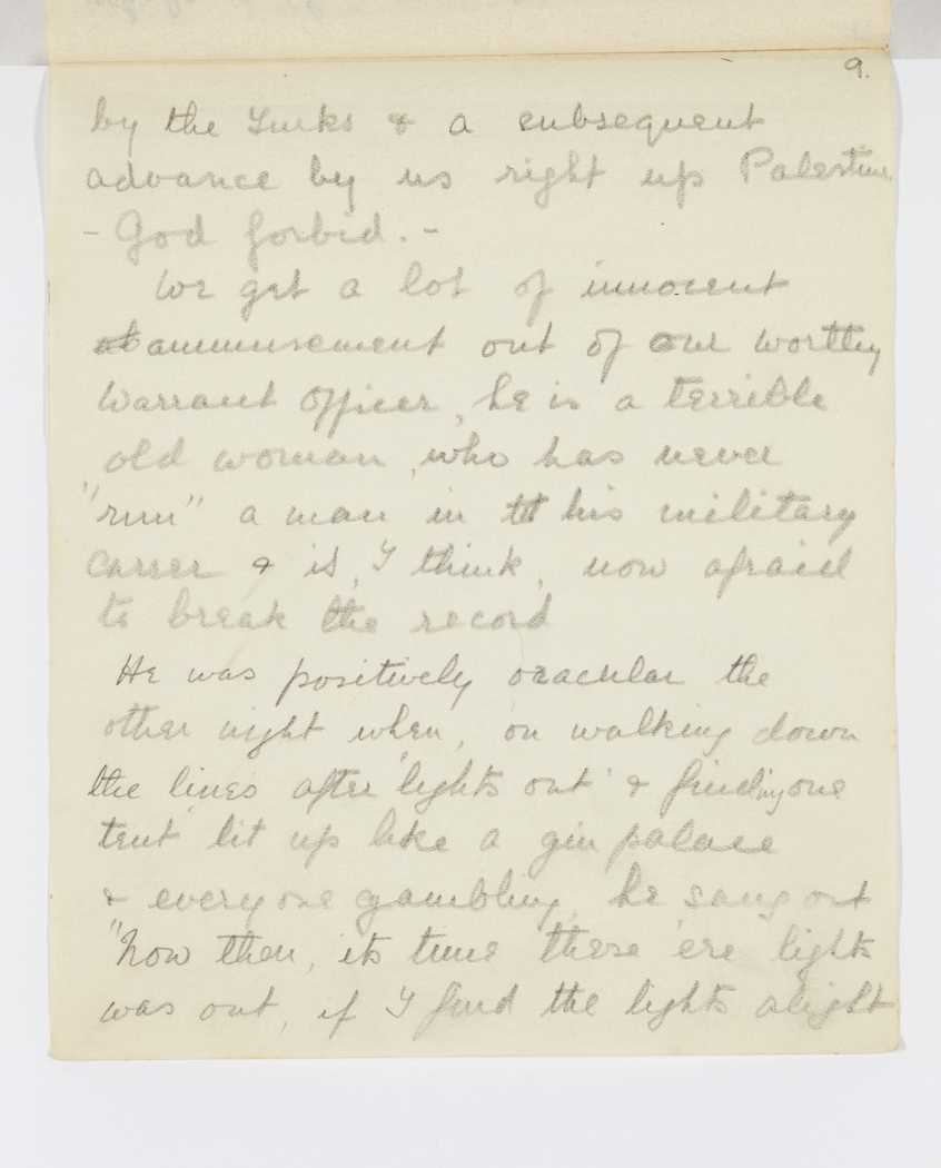 He was positively oracular the other night when, on walking down the line after 'lights out' & finding one tent lit up like a gin palace & everyone gambling, he sang out "Now then, its time these 'ere lights was out, if I find the lights alight