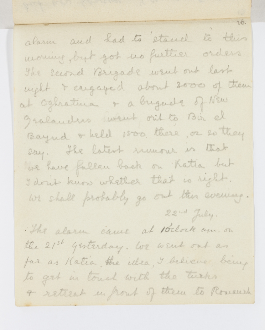 alarm and had to 'stand to' this morning, but got no further orders. The Second Brigade went out last night & engaged about 3000 of them at Oghratina & a brigade of New Zealanders went out to Bir el Bayud & held 1500 there or so they say. the latest rumour is that we have fallen back on Katia but I don't know whether that is right. We shall probably go out this evening.