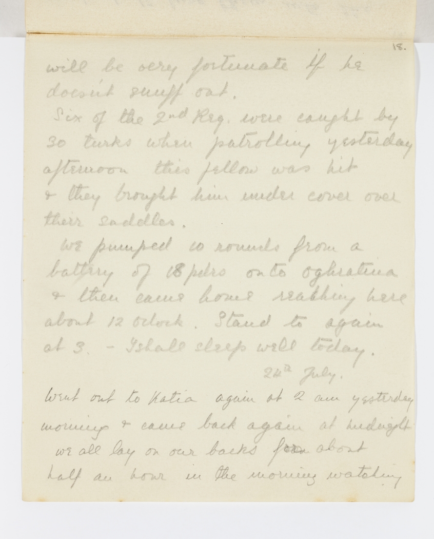 We pumped 10 rounds from a battery of 18 pdrs onto Oghratina & then came home reaching here about 12 oclock. Stand to again at 3 - I shall sleep well today.