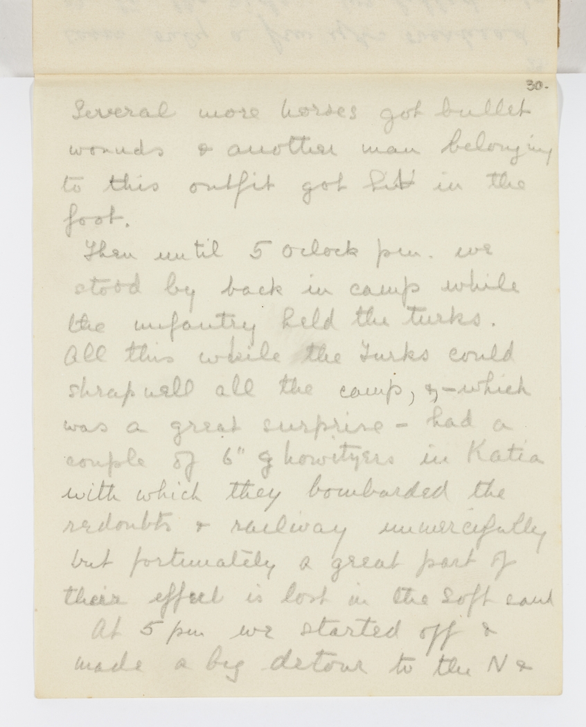 Then until 5 oclock pm. we stood by back in camp while the infantry held the turks. All this while the Turks could shrapnell all the camp, & - which was a great surprise €“ had a couple of 6" g howitzers in Katia with which they bombarded the redoubts & railway unmercifully but fortunately a great part of their effect is lost in the soft sand.