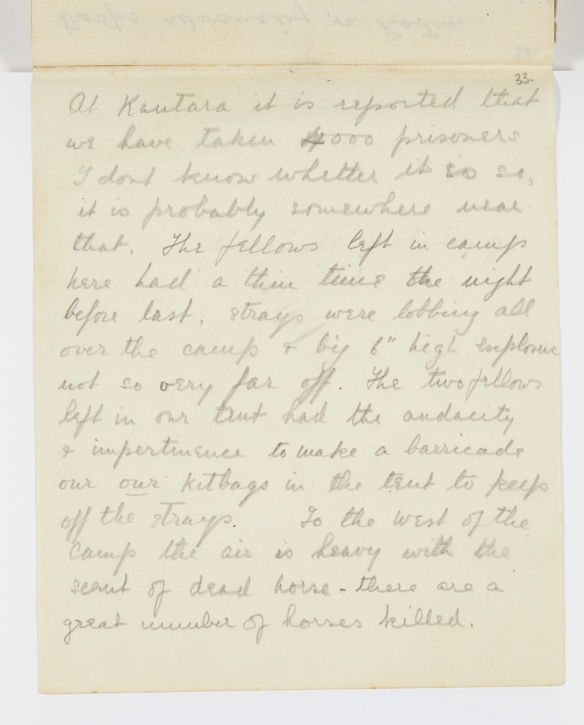 At Kautara it is reported that we have taken 4000 prisoners. I don't know whether it is so, it is probably somewhere near that. The fellows left in camp here had a thin time the night before last, strays were lobbing all over the camp & big 6" high explosives not so very far off. The two fellows left in out tent had the audacity & impertinence to make a barricade our our kitbags in the tent to keep off the strays. To the west of the camp the air is heavy with the scent of dead horse €“ there are a great number of horses killed.