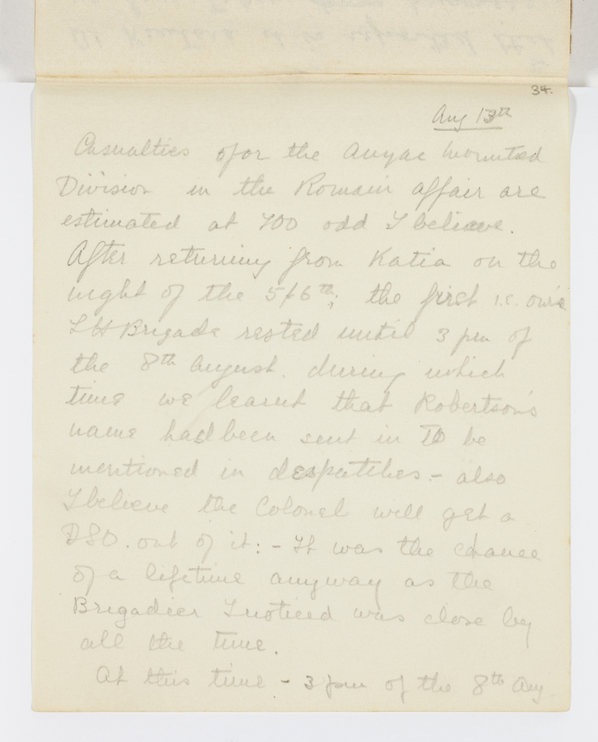 Casualties for the Anzac Mounted Division in the Romain affair are estimated at 700 odd I believe. After returning from Katia on the night of the 5 & 6th, the first i.e. our L H Brigade rested until 3 pm of the 8th August during which time we learnt that Robertson's name had been sent in to be mentioned in despatches €“ also I believe the Colonel will get a DSO. out of it: - It was the chance of a lifetime anyway as the Brigadier I noticed was close by all the time.
