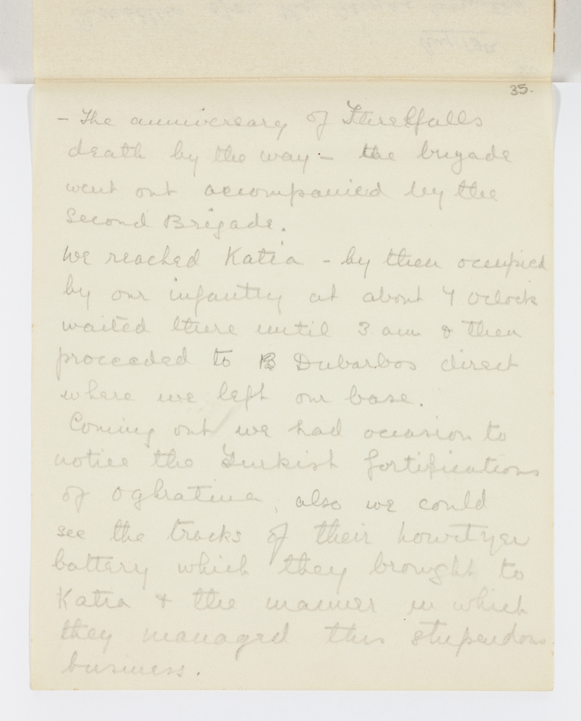 Coming out we had occasion to notice the Turkish fortifications of Oghratina, also we could see the tracks of their howitzer battery which they brought to Katia & the manner in which they managed this stupendous business.