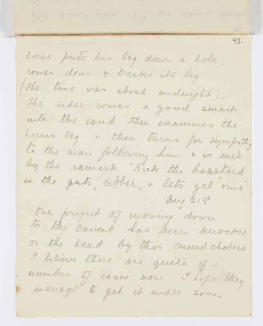horse puts his leg down a hole, comes down & breaks its leg. (The time was about midnight). The rider comes a good smack into the sand then examines the horses leg & then turns for sympathy to the man following him & is met by the remark "Kick the barstard in the guts, cobber & lets get 'oing"