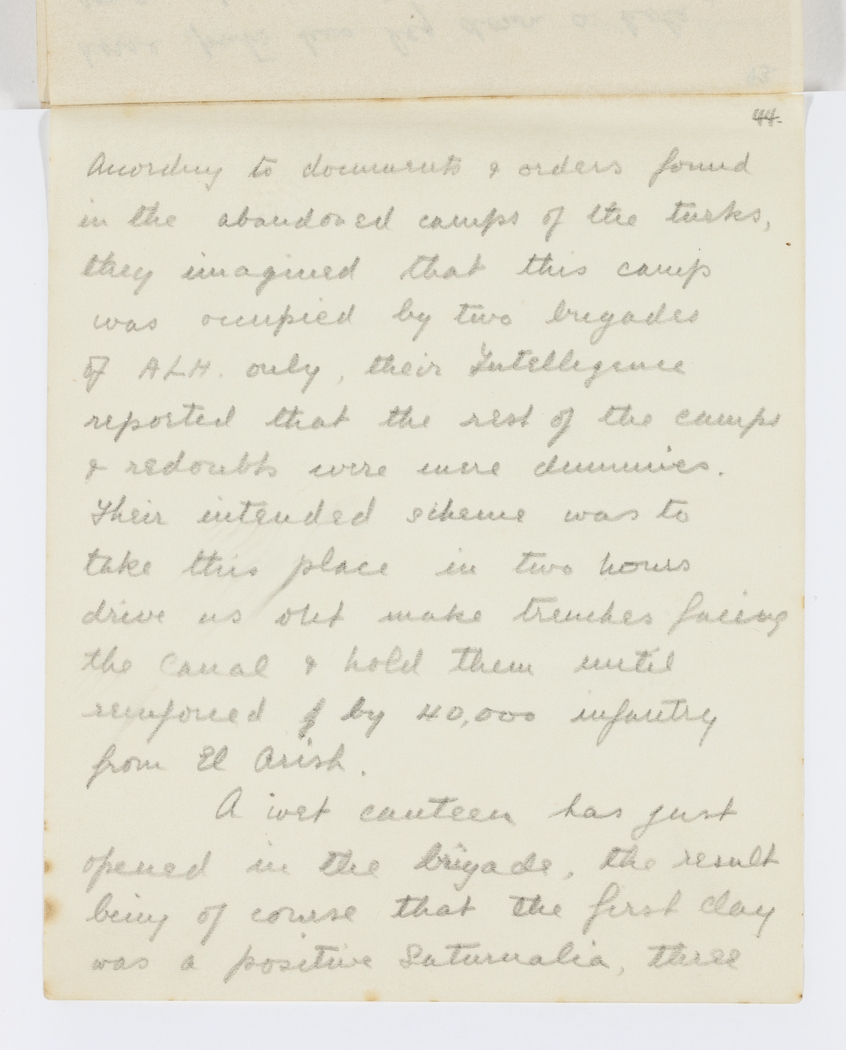 According to documents & orders found in the abandoned camps of the turks they imagined that this camp was occupied by two brigades of ALM. only, their Intelligence reported that the rest of the camps & redoubts were were dummies. Their intended scheme was to take this place in two hours drive us out make trenches facing the canal & hold them until reinforced by 40,000 infantry from El Arish.