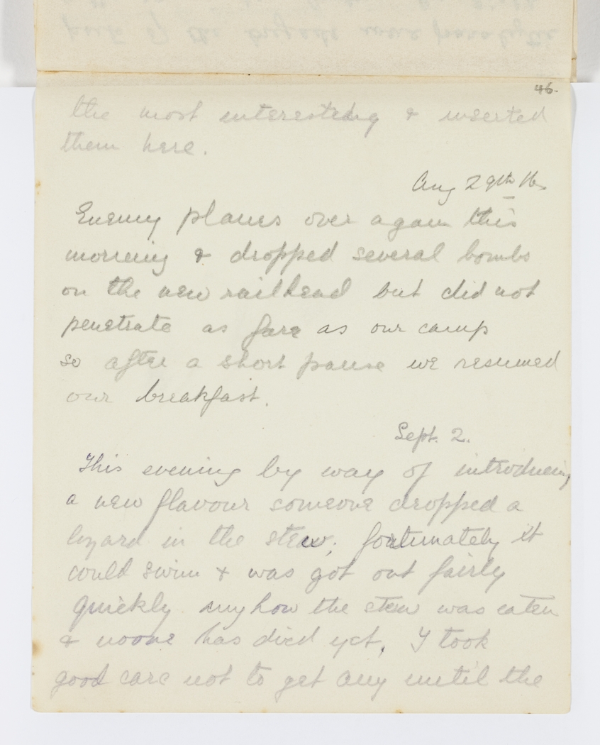 This evening by way of introducing a new flavour someone dropped a lizard in the stew; fortunately it could swim & was got out fairly quickly anyhow the stew was eaten & no one has died yet, I took good care not to get any until