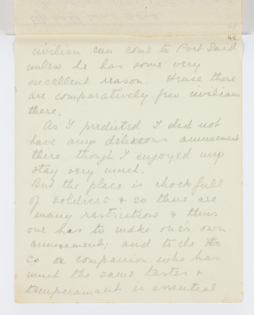 But the place is chock full of soldiers & so there are many restrictions & thus one has to make ones own amusement; and to do so a companion who has much the same tastes & temperament is essential.