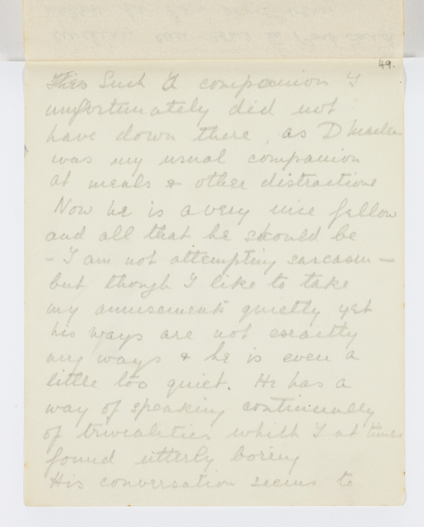 This Such a companion I did unfortunately did not have down there, as D Maclean was my usual companion at meals & other distractions. Now he is a very nice fellow and all that he should be €“ I am not attempting sarcasm - but though I like to take my amusements quietly yet his ways are not exactly my ways & he is even a little too quiet. He has a way of speaking continually of trivialties which I at times found utterly boring. His conversation seems to