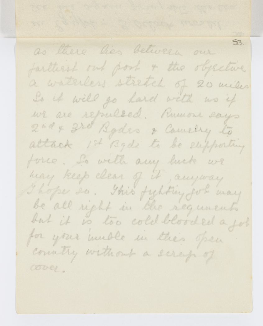 as there lies between our farthest out post & the objective a waterless stretch of 20 miles. So it will go hard with us if we are repulsed. Rumour says 2nd & 3rd Bgdes & Camelry to attack 1st Bgde to be supporting force. So with any luck we may keep clear of it, anyway I hope so. This fighting job may be all right in the regiments but it is too cold blooded a job for your [indecipherable] in this open country without a scrap of cover.
