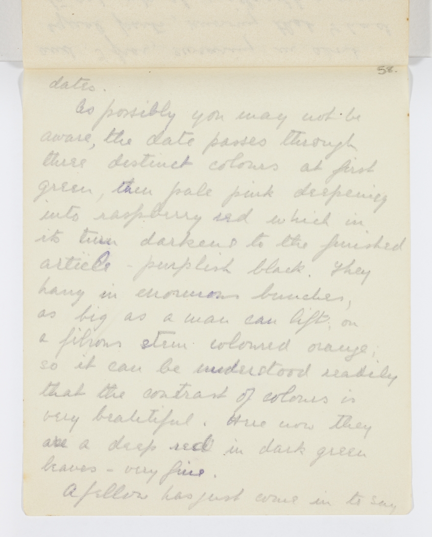 As possibly you may not be aware, the date passes through three distinct colours at first green, then pale pink deepening into raspberry red which in its turn darkens to the finished article purplish black. They hang in enormous bunches, as big as a man can lift on a fibrous stem coloured orange so it can be understood readily that the contrast of colours is very beautiful. Here now they are a deep red in dark green leaves  €“ very fine.