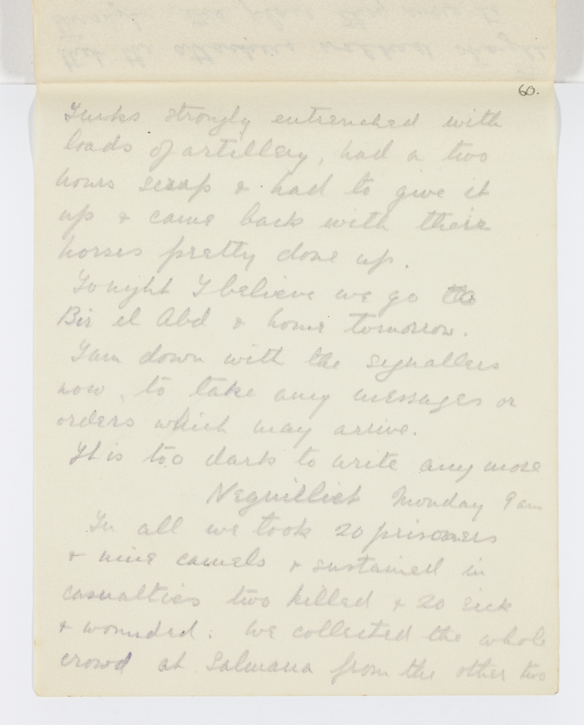In all we took 20 prisoners & nine camels & sustained in casualties two killed & 20 sick & wounded. We collected the whole crowd at Salmana from the other two