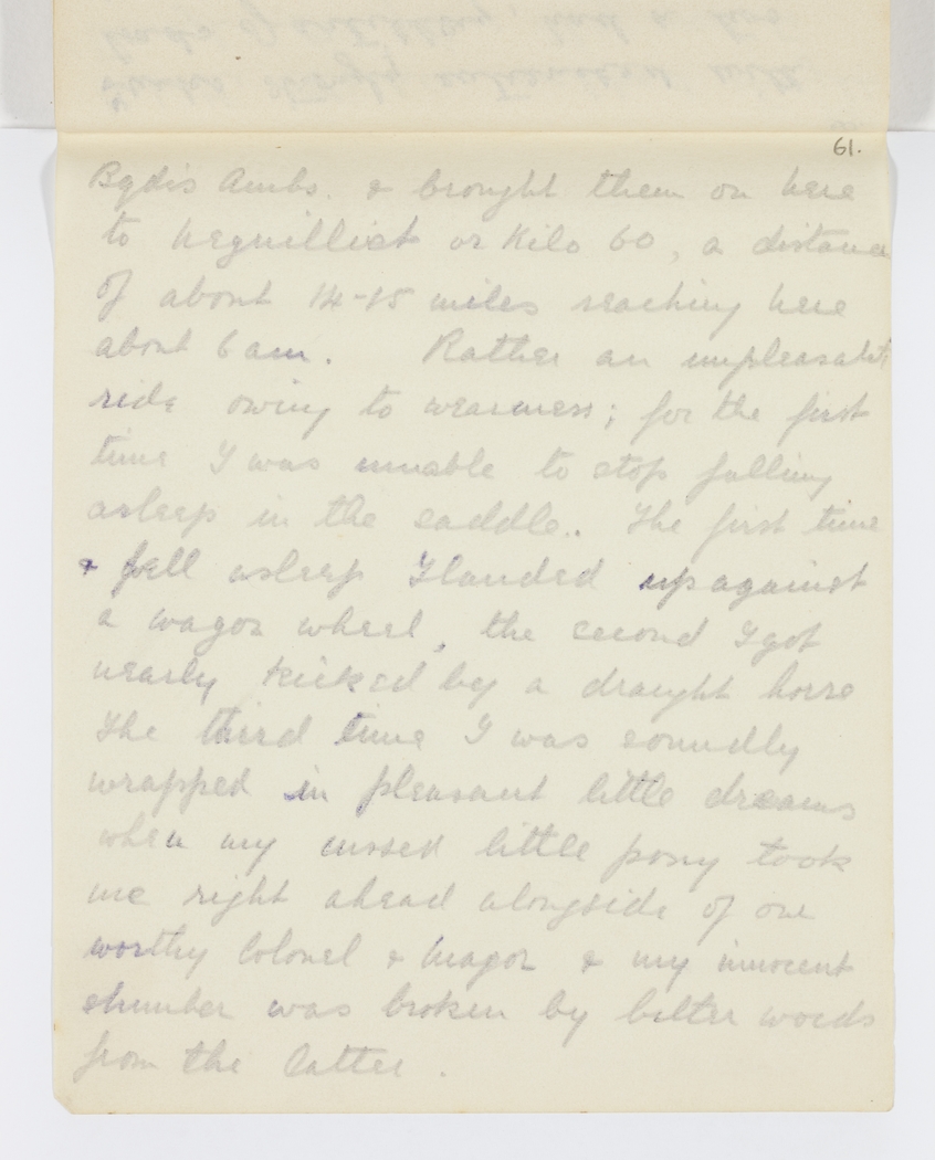 Bgd's Ambs. & brought them on here to Nequilliet or Kilo 60, a distance of about 14-15 miles reaching here about 6 am. Rather an unpleasant ride owing to weariness; for the first time I was unable to stop falling asleep in the saddle. The first time & fell asleep I landed up against a wagon wheel, the second I got nearly kicked by a draught horse. The third time I was soundly wrapped in pleasant little dreams when my cussed little pony took me right ahead alongside of one worthy Colonel & Major & my innocent slumber was broken by bitter words from the latter.