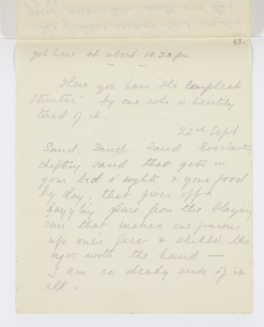 Sand, Sand, Sand Everlasting shifting sand that gets in your bed o'nights & your food by day; that gives off a dazzling glare from the blazing sun that makes one pucker up one's face & shield the eyes with the hand €“ I am so deadly sick of it all.