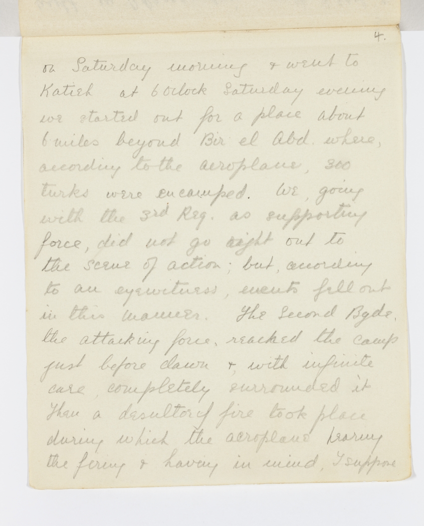 on Saturday morning & went to Katieh. At 6 oclock Saturday evening we started out for a place about 6 miles beyond Bir el Abd where, according to the aeroplane, 300 turks were encamped. We, going with the 3rd Reg. as supporting force, did not go right out to the scene of action; but according, to an eyewitness, events fell out in this manner. The second Bgde, the attacking force, reached the camp just before dawn & with infinite care completely surrounded it. Then a desultory fire took place during which the aeroplane hearing the firing & having in mind, I suppose