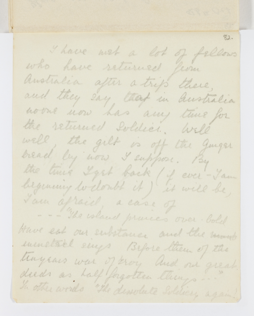 I have met a lot of fellows who have returned from Australia after a trip there, and they say that in Australia no one now has any time for the returned Soldier. Well well, the gilt is off the Ginger bread by now I suppose. By the time I get back (if ever I am beginning to doubt it) it will be, I am afraid, a case of ----"the island princes over bold. Have eat our substance and the uni nstated sings. Before them of the 10 years war of Troy And our great deeds as half forgotten things €¦." In other words "The dissolute Soldier, again