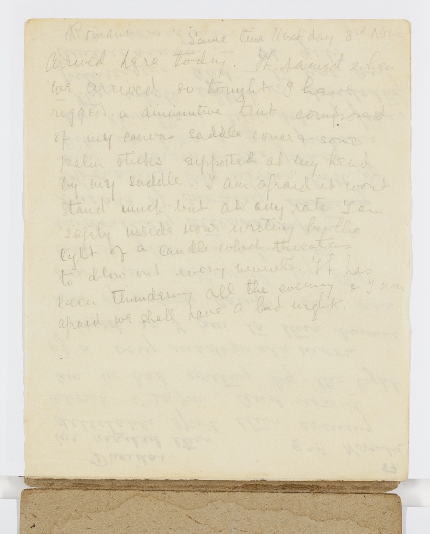 Arrived here today. It rained when we arrived so tonight I have rigged a diminutive tent composed of my canvas saddle cover & some palm sticks supported at my head by my saddle. I am afraid it won't stand much but at any rate I am safely inside now writing by the light of a candle which threatens to blow out every minute. It has been thundering all the evening & I am afraid we shall have a bad night.