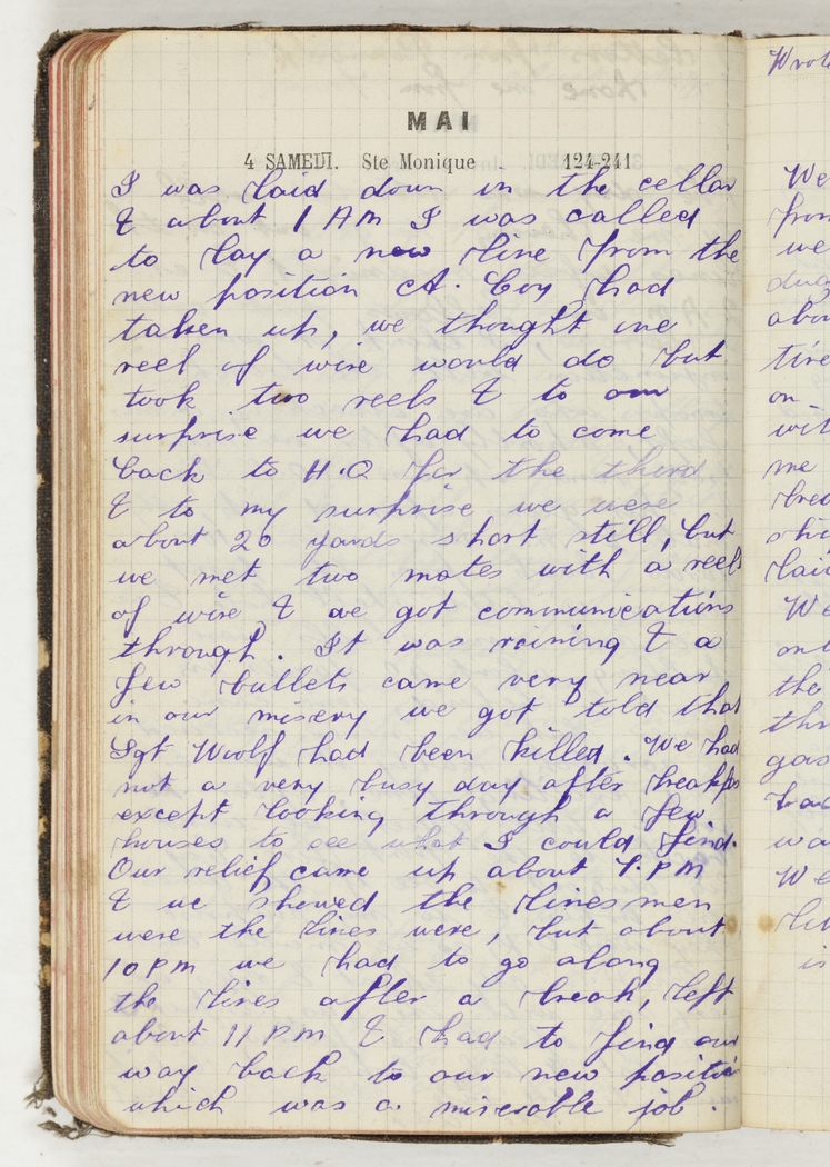 I was laid down in the cellar & about 1 AM I was called to lay a new line from the new position A. Coy had taken up, we thought one reel of wire would do but took two reels & to our surprise we had to come back to H.Q for the third & to my surprise we were 20 yards short still, but we met two mates with a reel of wire & we got communications through. It was raining & a few bullets came very near in our misery we got told that Sgt Woolf had been killed. We had not a very busy day after breakfast except looking through a few houses to see what i could find. Our relief came up about 7. PM & we showed the linesmen were the lines were, but about 10 PM we we had to go along the lines after a break, left about 11 PM & had to find our way back to our new position which was a miserable job.