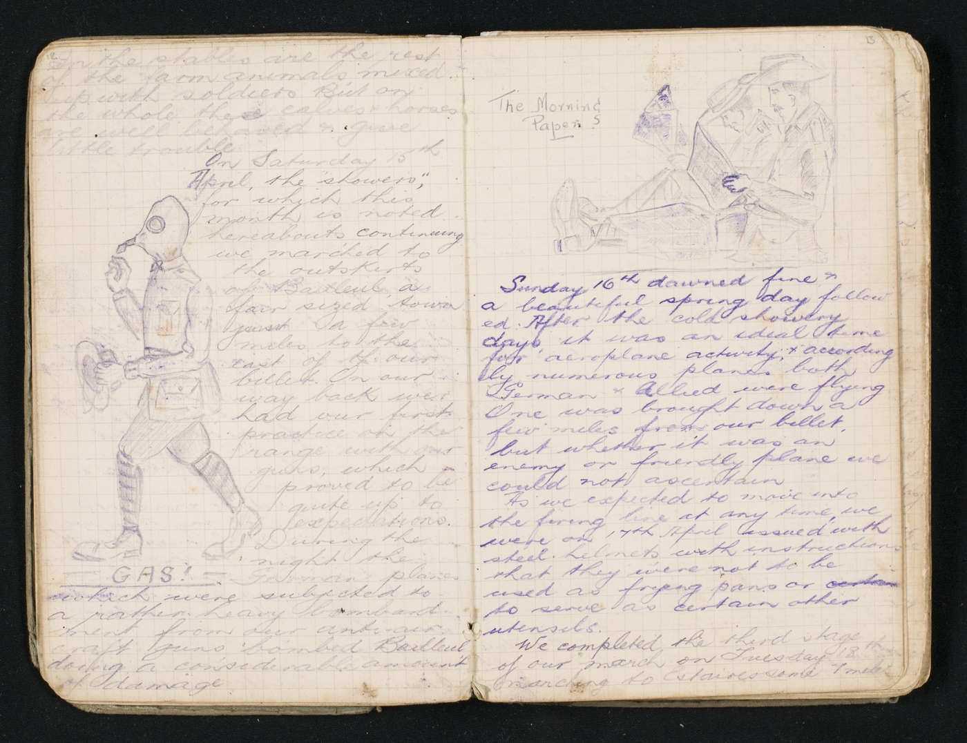 [Sketch of soldier with gas mask on, captioned: GAS!]