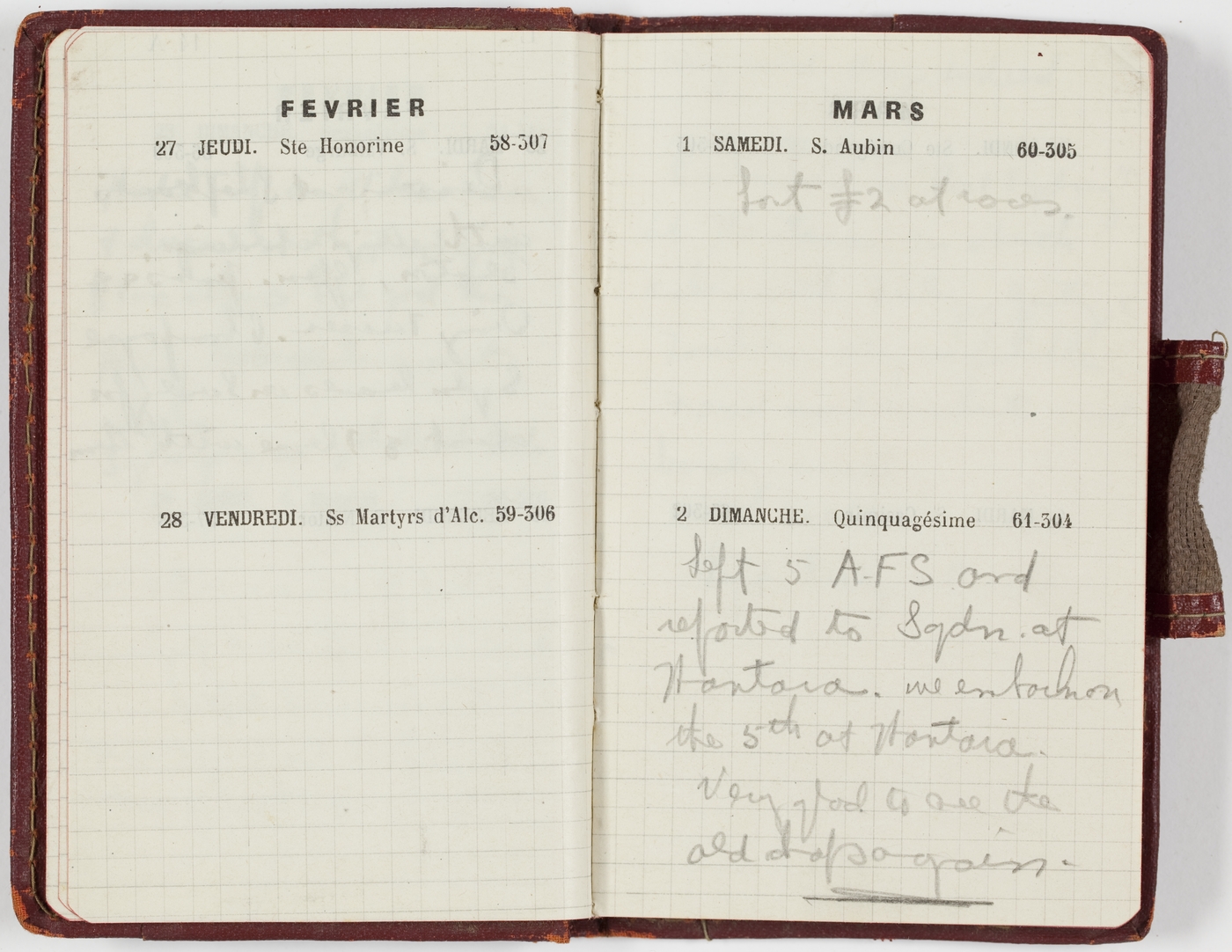 [2 Dimanche]Left 5 A.F.S. and reported to Sgdn. at Hantara. We embark on the 5th at Hantara.