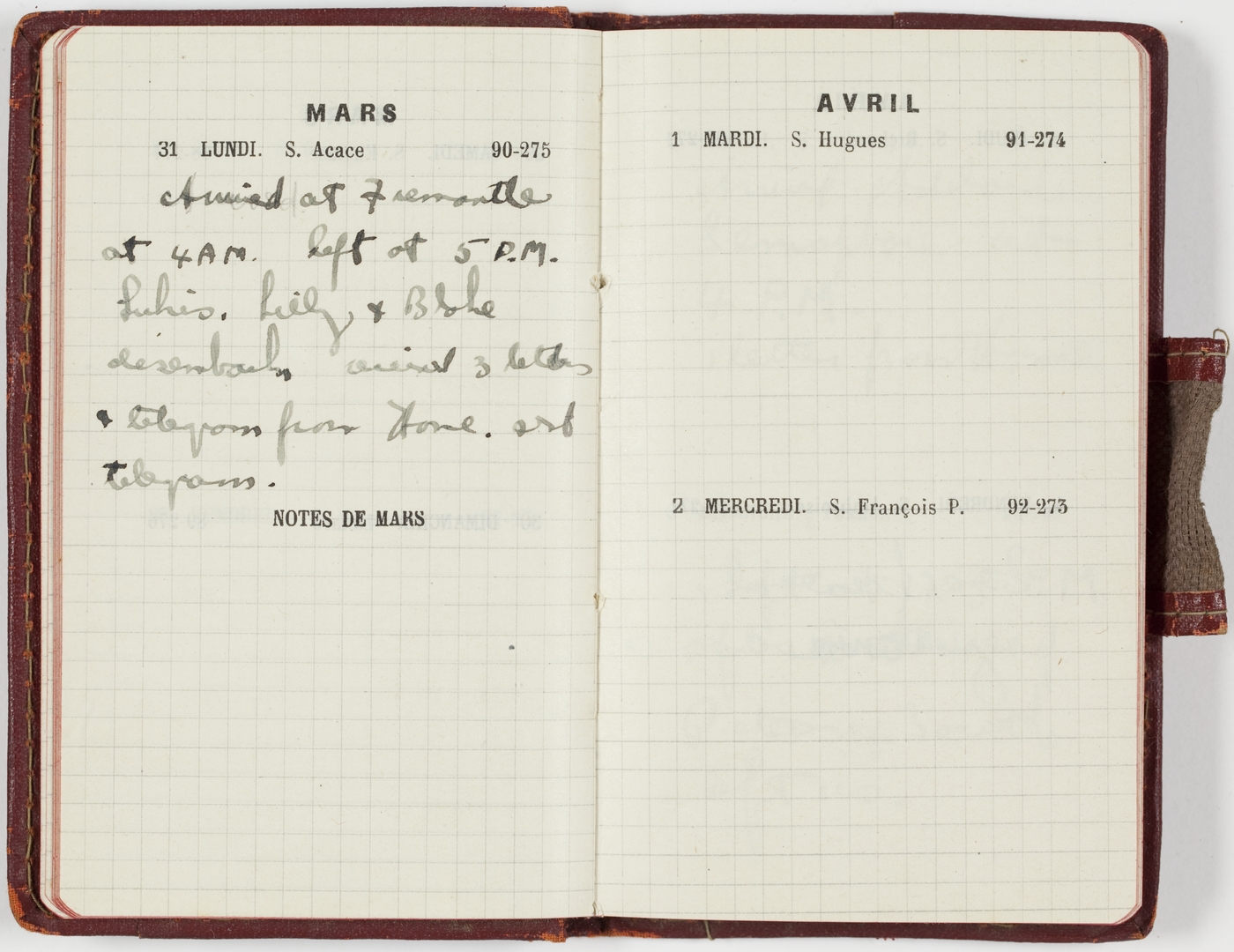 [Mars 31 Lundi]Arrived at Fremantle at 4 am. Left at 5 p.m. Lukis, Lilly & Bloke disembark, received 3 letters & telegram from Home. sent telegrams.