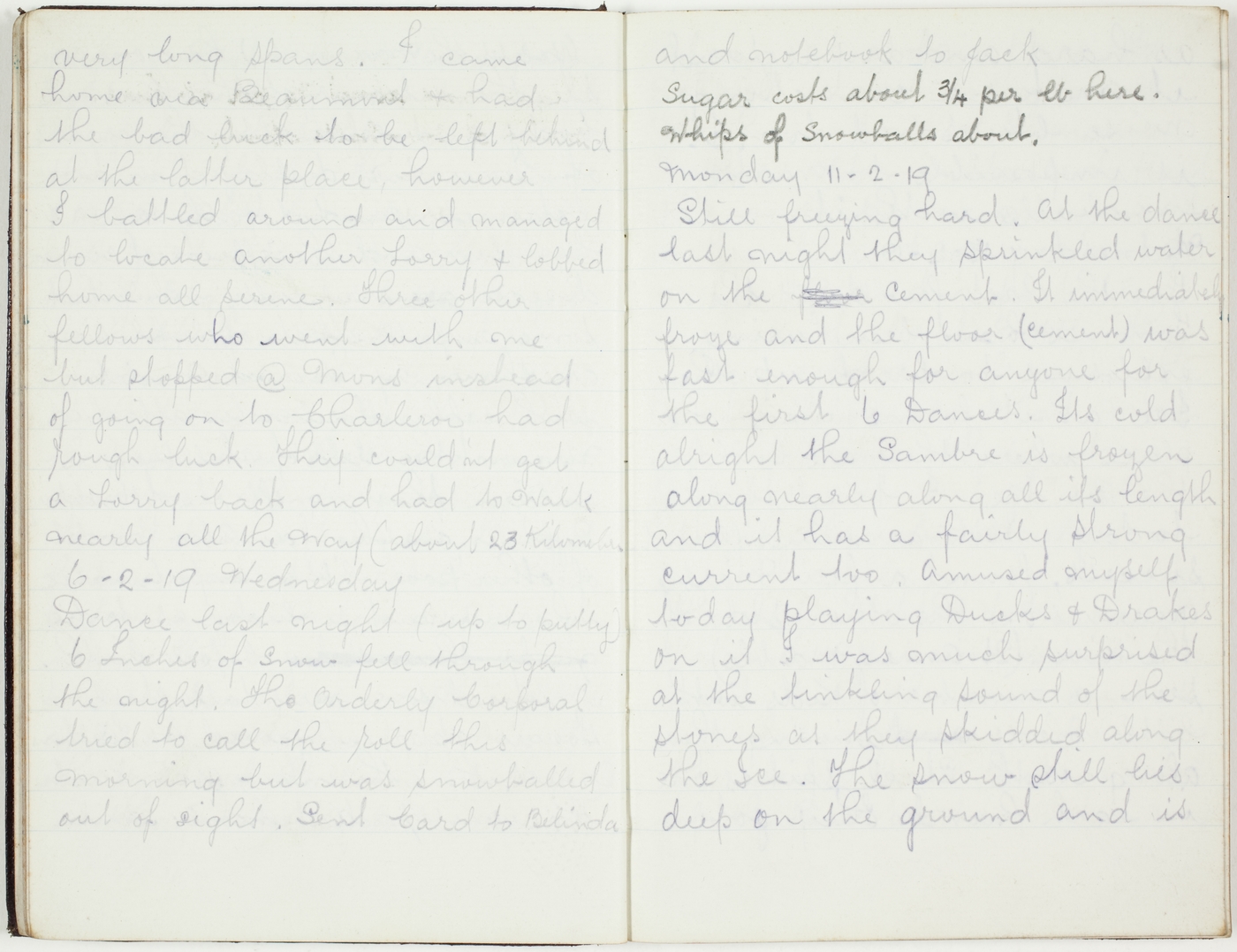 Still freezing hard. At the dance last night they sprinkled water on the floor cement. It immediately froze and the floor (cement) was fast enough for anyone for the first 6 Dances. Its cold alright the Sambre is frozen along nearly all its length and it has a fairly strong current too. Amused myself today playing Ducks & Drakes on it. I was much surprised at the tinkling sound of the stones as they skidded along the Ice. The snow still lies deep on the ground and is
