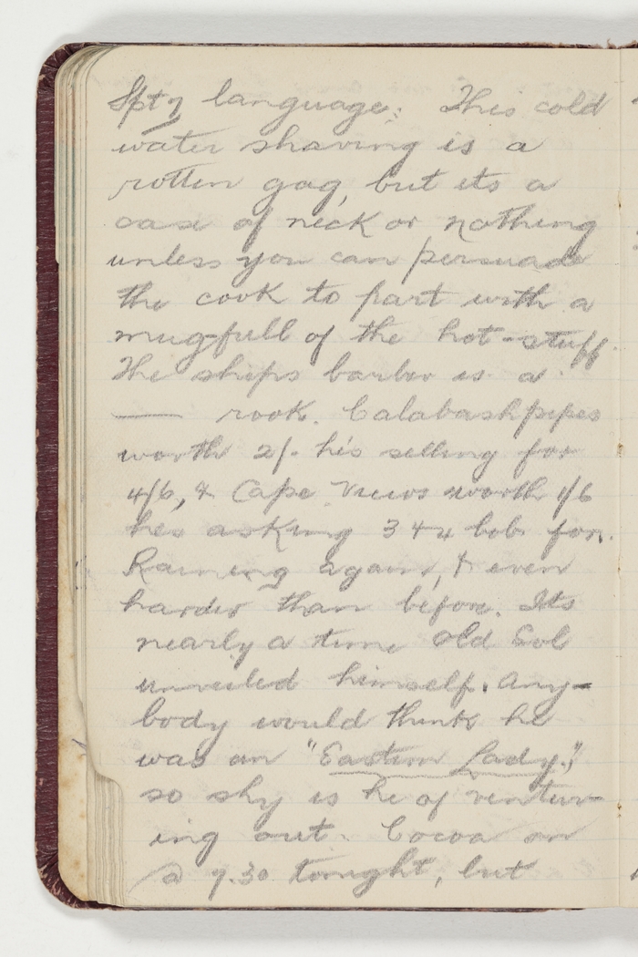 Spt 7 language. This cold water shaving is a rotten gag, but it's a case of neck or nothing unless you can persuade the cook to part with a mug-full of the hot-stuff The ships barber is a ----- rook. Calabash pipes worth 2/- he's selling for 4/6, & Cape Views worth 1/6 hes asking 3 & 4 bob for. Raining again, & even harder than before. Its nearly time old Sol unveiled himself. Anybody would think he was an "Eastern Lady", so shy is he of venturing out. Cocoa on at 7.30 tonight, but
