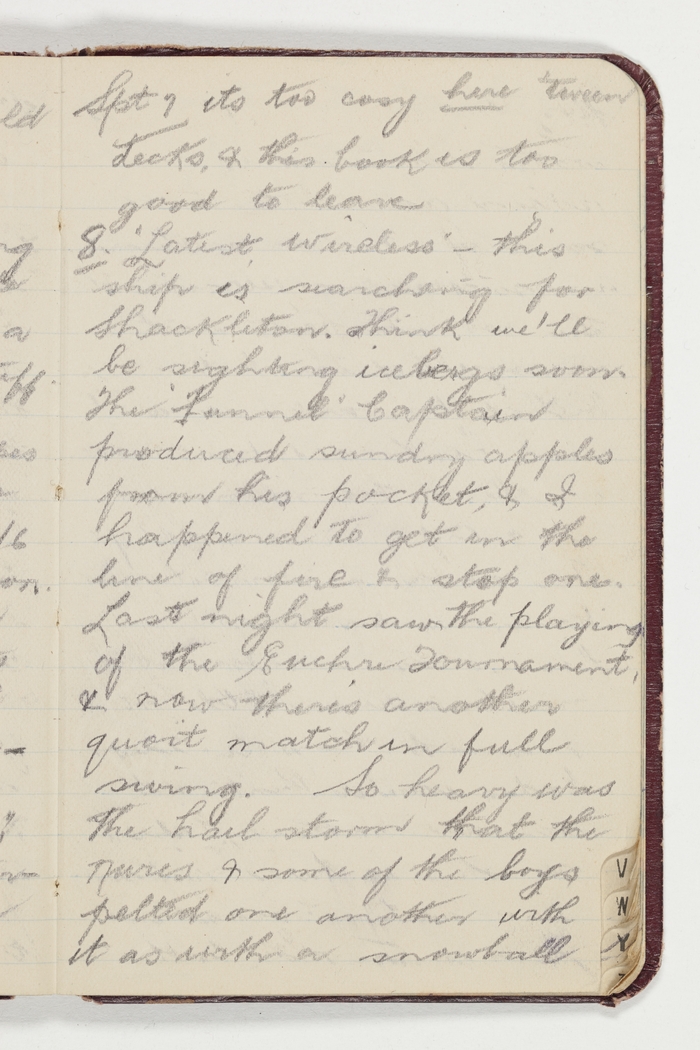 8 'Latest Wireless' – this ship is searching for Shackleton. Think we'll be sighting icebergs soon. The 'Funnel' Captain produced sundry apples from his pocket, & I happened to get in the line of fire & stop one.