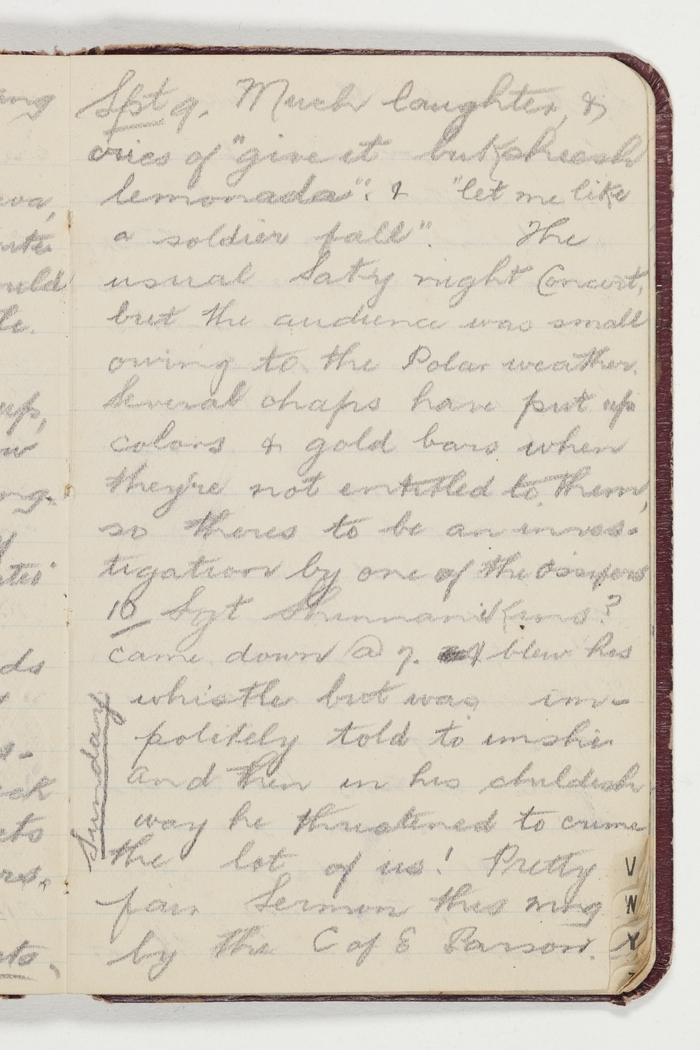 Spt 9 Much laughter & cries of "give it buksheesh lemonade" & "let me like a soldier fall". The usual Saty night concert, but the audience was small owing to the Polar weather. Several chaps have put up colors & gold bars when they're not entitled to them, so theres to be an investigation by one of the ossifers.