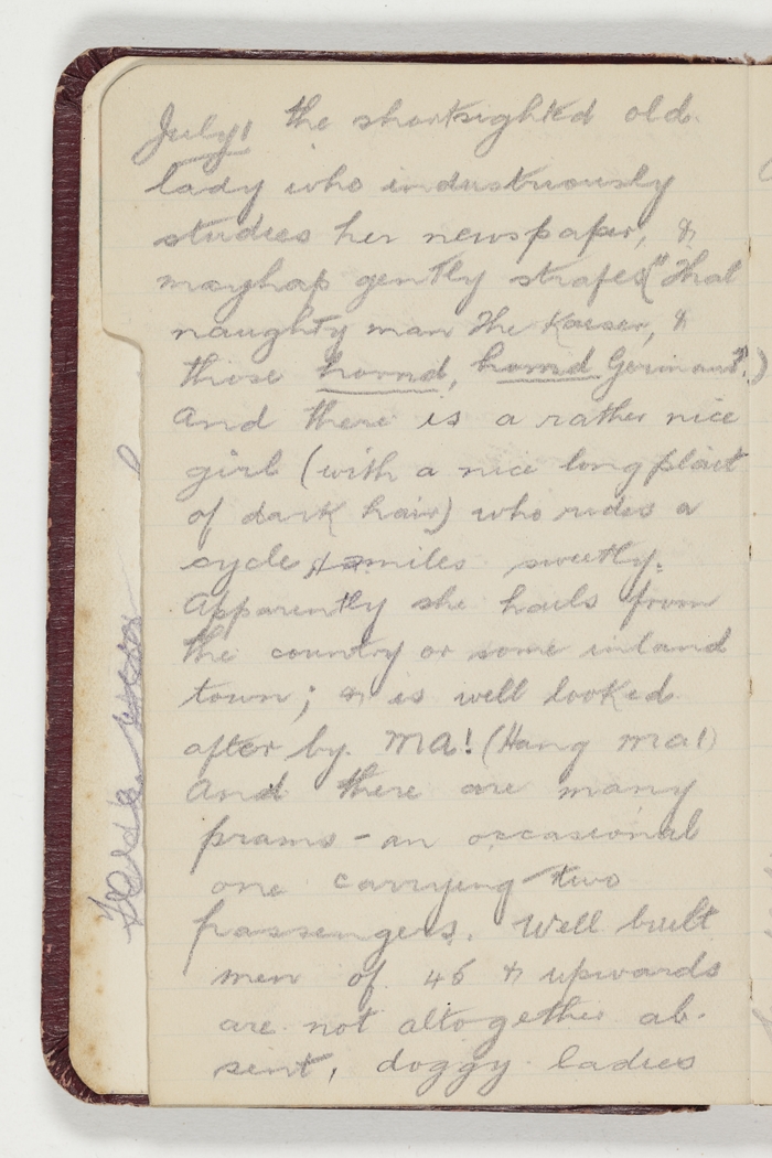 July 1 the shortsighted old lady who industriously studies her newspaper, & mayhap gently strafes "That naughty man The Kaiser, & those horned, horrid Germans. And there is a rather nice girl (with a nice long plait of dark hair) who rides a cycle & smiles sweetly. Apparently she hails from the country or some inland town; & is well looked after by MA! (Hang MA!) And there are many prams – an occasional one conveying two passengers. Well built men of 45 & upwards are not altogether absent, doggy ladies