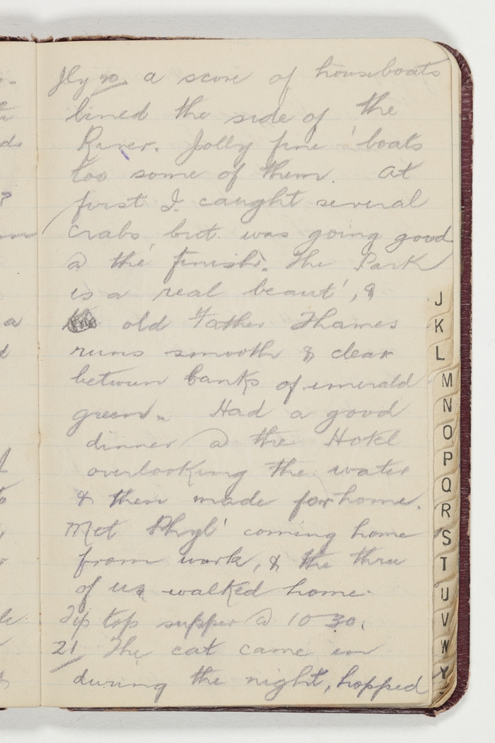 Jly 20 a score of houseboats lined the side of the River. Jolly fine 'boats too some of them. At first I caught several crabs, but was going good at the finish. The Park is a real beaut', & old Father Thames runs smooth & clear between banks of emerald green. Had a good dinner at the Hotel overlooking the water & then made for home. Met Phyl' coming home from work, & the three of us walked home. Tip top supper at 10.30.