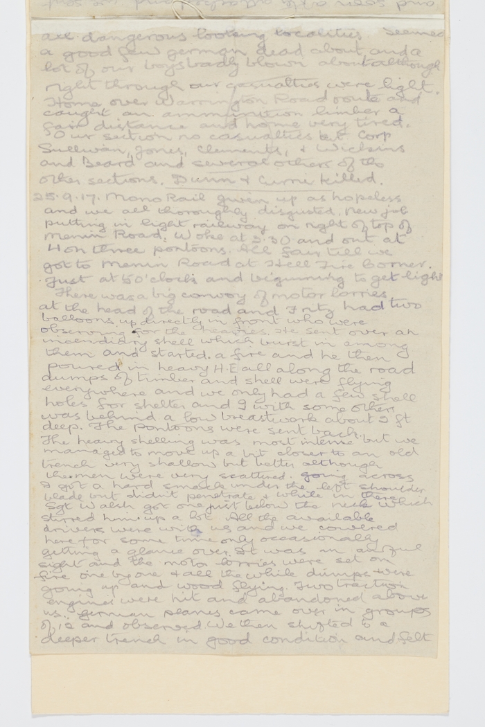 The heavy shelling was most intense but we managed to move up a bit closer to an old trench very shallow but better although the men were very scattered. Going across I got a hard smack under the left shoulder blade but didn't penetrate & while in there Sgt Walsh got one just below the neck which stirred him up a lot. All the available drivers were with us and we cowered here for some time only occasionally getting a glance over.