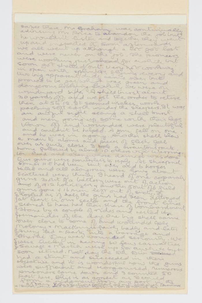 Home by a couple of rides and rested the remainder of the day. One big shell came over close to some of and wounded cpls Moloney & MacKenzie fairly badly and later Avery led a party into a barrage and Charlie Day was wounded seriously. We were lucky in having so few casualties Savage & Martier were up for a while but soon retired.