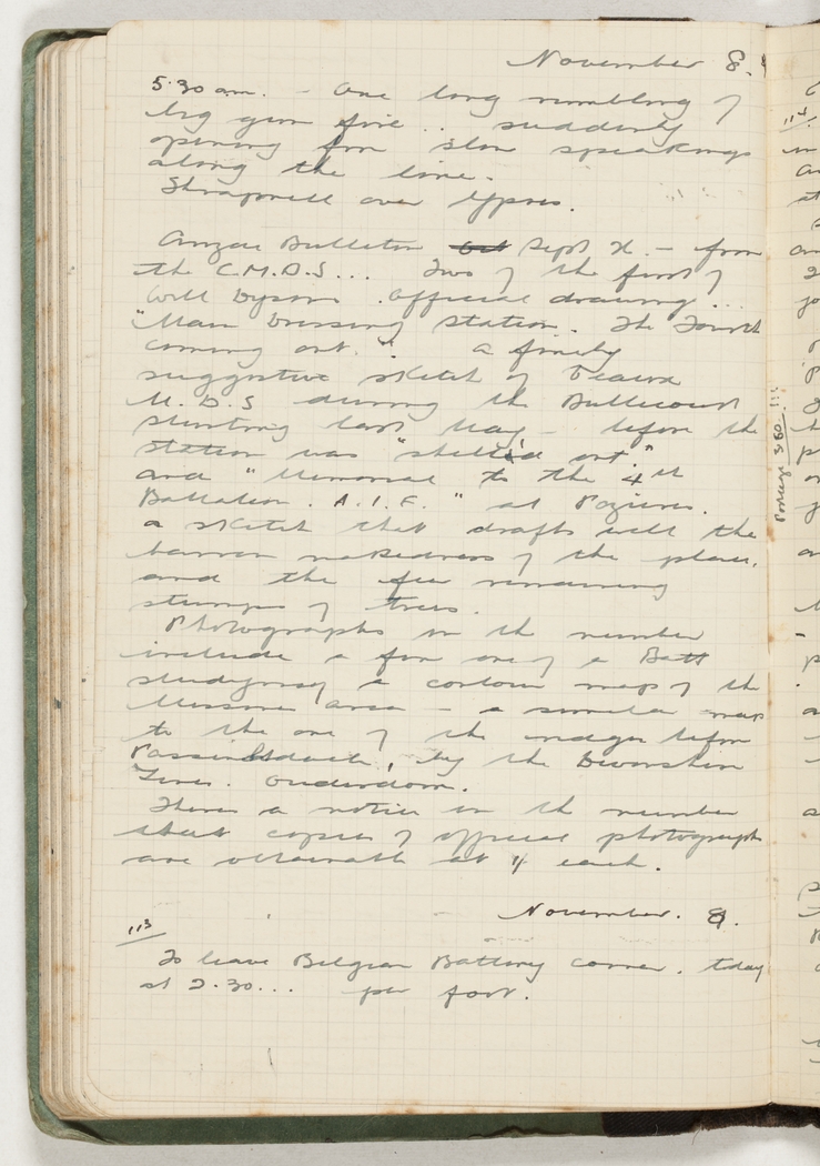 5.30 a.m. – One long rumbling of big gun fire.. suddenly opening from slow speakings along the line. Shrapnell over Ypres.